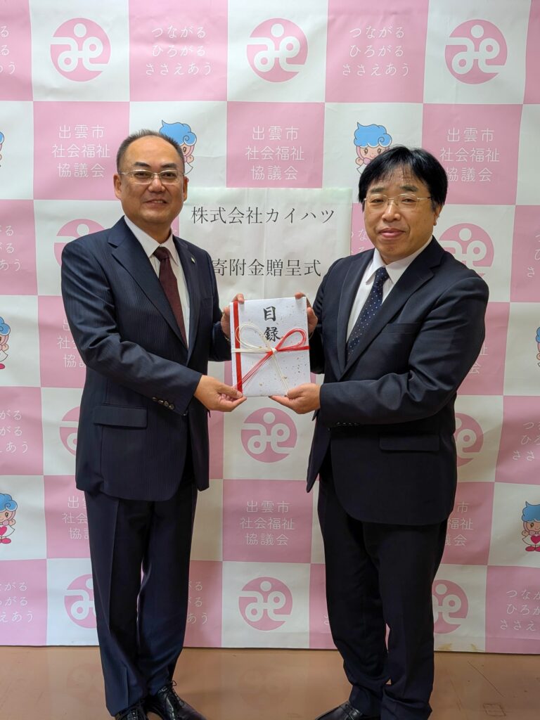 (写真左から)株式会社カイハツ 代表取締役社長 三代幸治、社会福祉法人出雲市社会福祉協議会 金築真志 会長